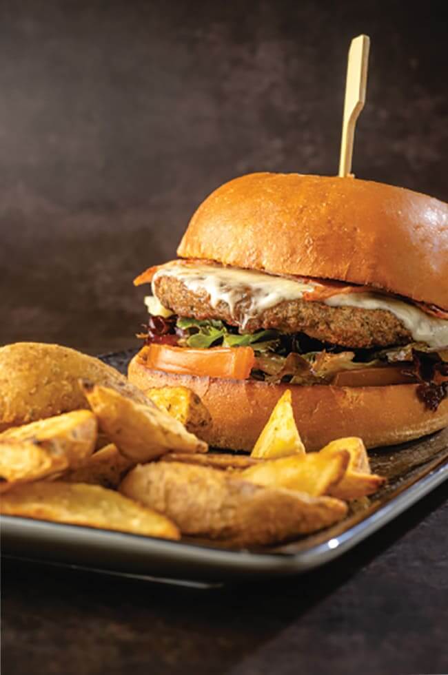 - Burger µε µοσχαρίσιο µπιφτέκι, BBQ σως, µπέικον, ντοµάτα & τυρί ένταµ. Σερβίρεται µε τραγανές πατάτες / with beef burger, BBQ sauce, bacon, tomato & edam cheese. Served with crispy potatoes.