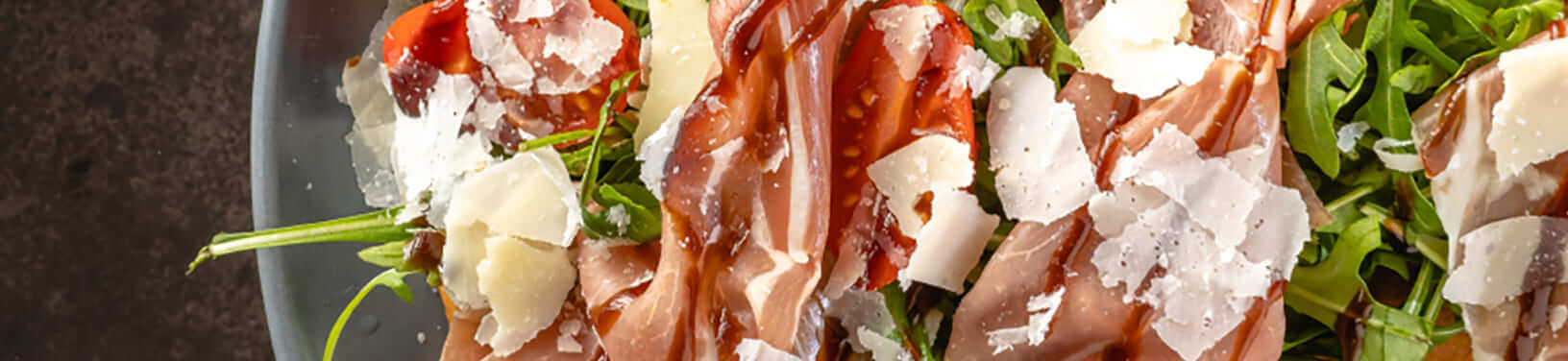 - Italian: τυρί edam, mozzarella, prosciutto,ντοµατίνια, παρµεζάνα, κρέµα βαλσάµικο, ρόκα / edam cheese, mozzarella, prosciutto, cherry tomato, parmesan, balsamic sauce, arugula