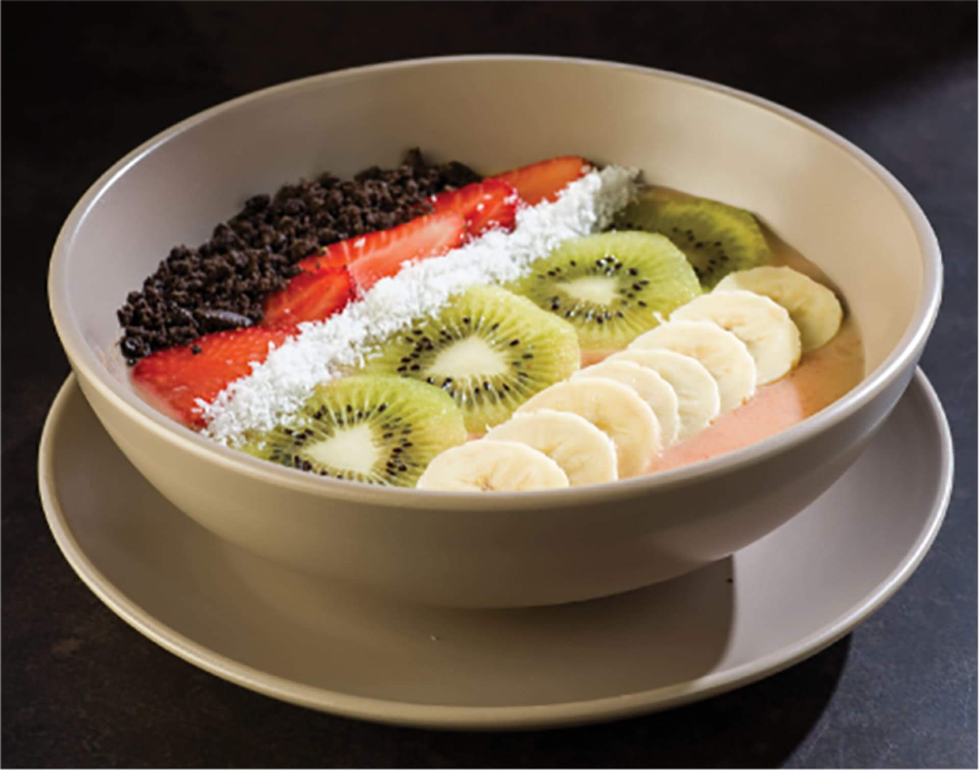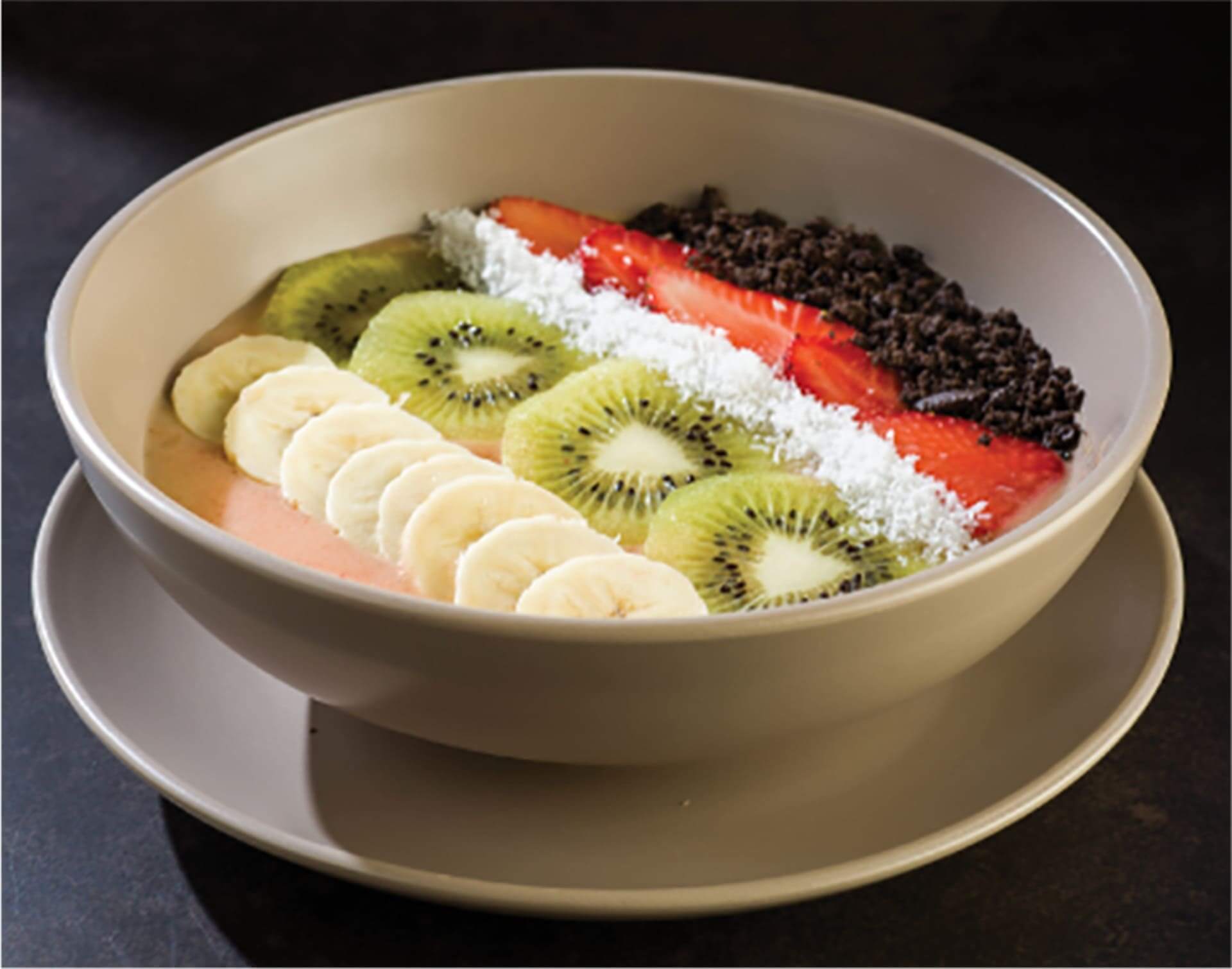 - Pink: βάση απο φράουλα,ροδάκινο και µπανάνα, συνοδεύται µε φρούτα εποχής, καρύδα και τριµµένο oreo / strawberry,peach and banana smoothie, topped with fresh fruits,coconut and crumbled oreo