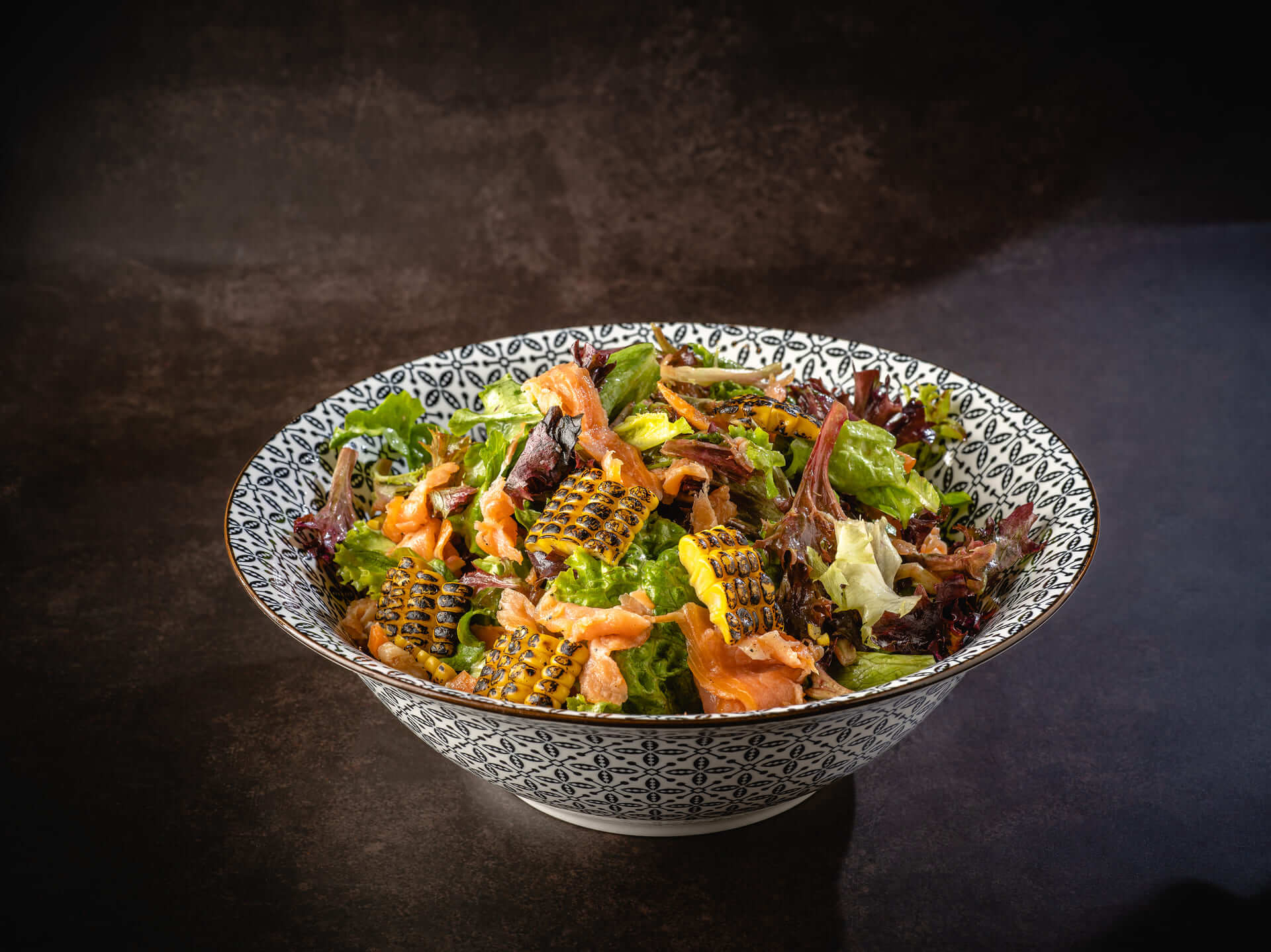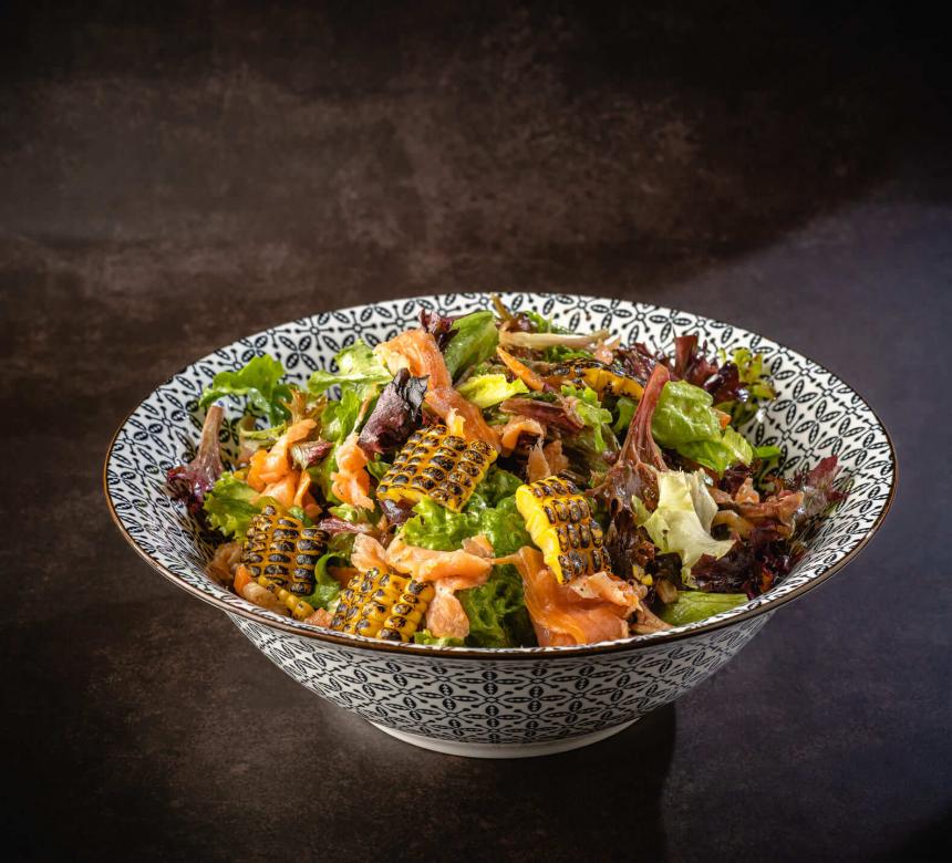 - Colorful Salad µε σολοµό, καλαµπόκι & άνηθο, ντρέσινγκ εσπεριδοειδών / with salmon, corn & dill, citrus dressing